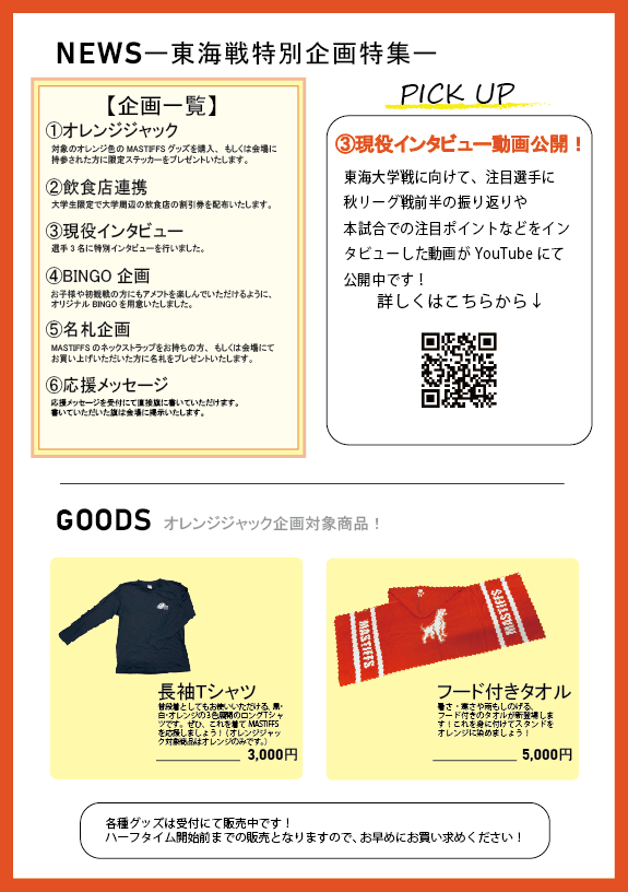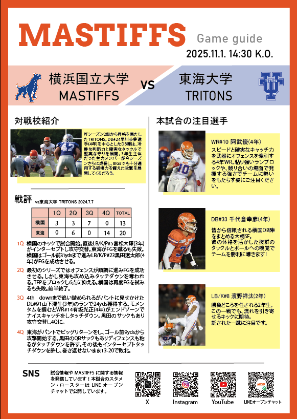 東海大学戦みどころ 2025 10/31 midokoro NEWS 2025年10月31日 midokoro NEWS よかったらシェアしてね! URLをコピーしました! URLをコピーしました! 【Last Essay’25 #8】DL#98 Kensias Kristanto 【東海大学戦】BINGO企画中止のお知らせ 関連記事 【合同練習を行いました!】 2025年12月20日 【帝京大学戦】試合企画のご案内 2025年11月28日 帝京大学戦みどころ 2025年11月28日 【Last Essay’25 #16】TR 大平京夏 2025年11月27日 【Last Essay’25 #17】QB#1 大矢悠人 2025年11月27日 【Last Essay’25 #20】MG 木下歩果 2025年11月27日 【Last Essay’25 #19】OL#60 髙森智己 2025年11月26日 【Last Essay’25 #18】OL#73 宮本響 2025年11月25日